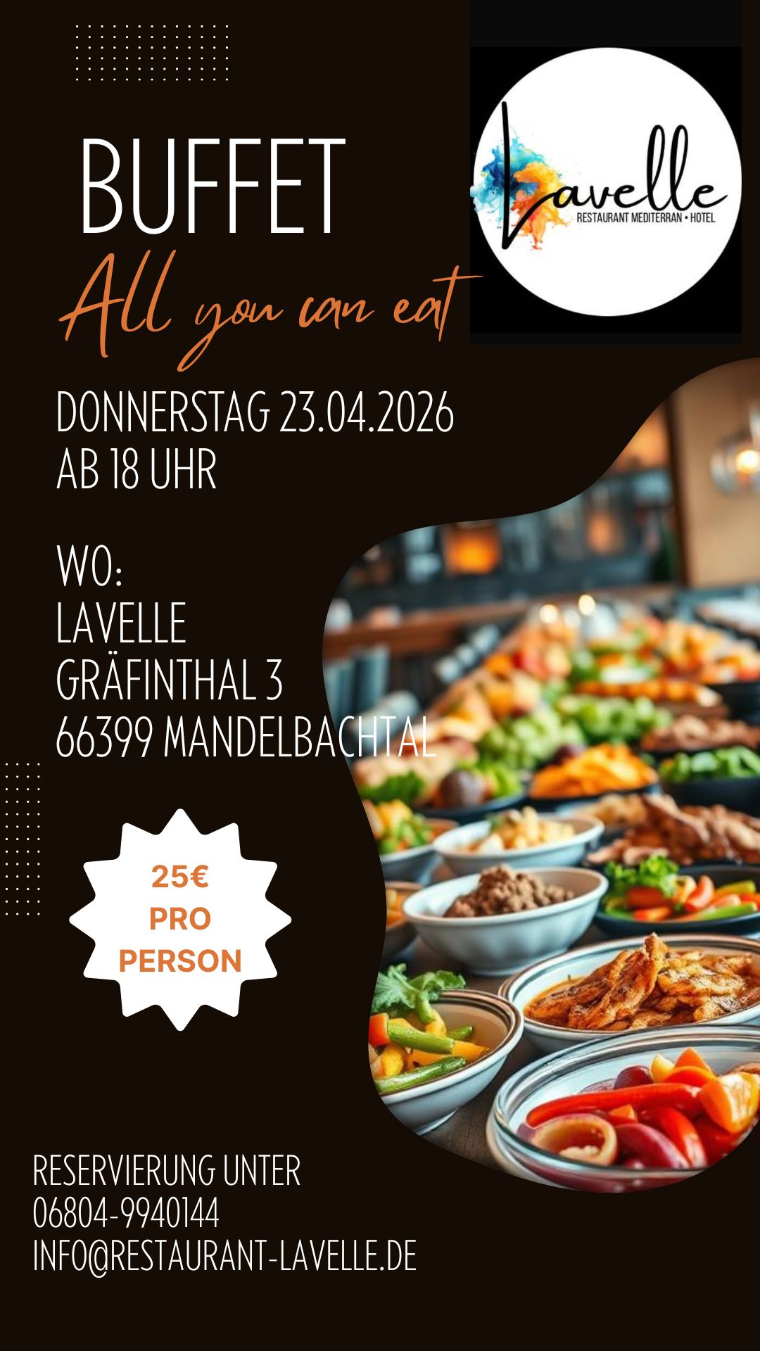 06804-9940144 oder info@restaurant-lavelle.de